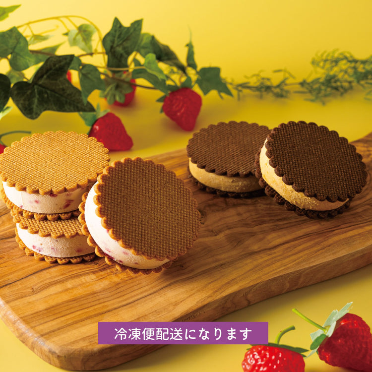 しっとりサクサクのクッキー生地に、ホワイトチョコ・苺・ラズベリーを合わせたアイスをサンド。中には苺コンフィチュールを閉じ込めています。