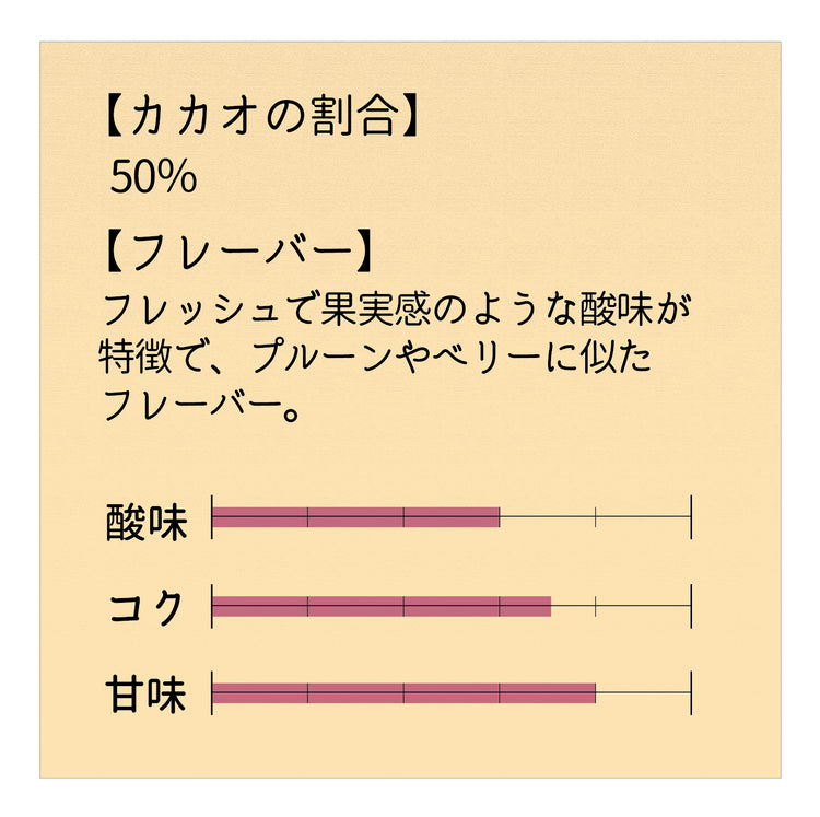 タンザニア産のカカオ豆はフレッシュで果実のような酸味が特徴的で、プルーンやベリーに似たフレーバーを持つカカオです。酸味と甘みのバランスも良く、風味の中にほのかな甘さと心地よい酸味が感じられます。