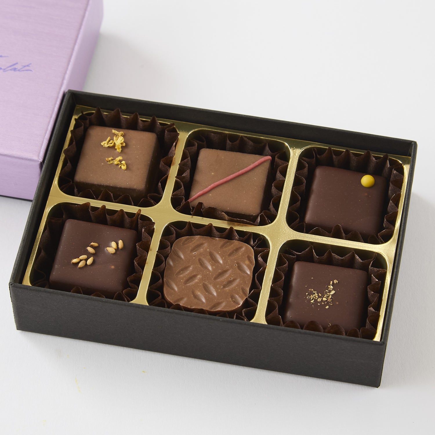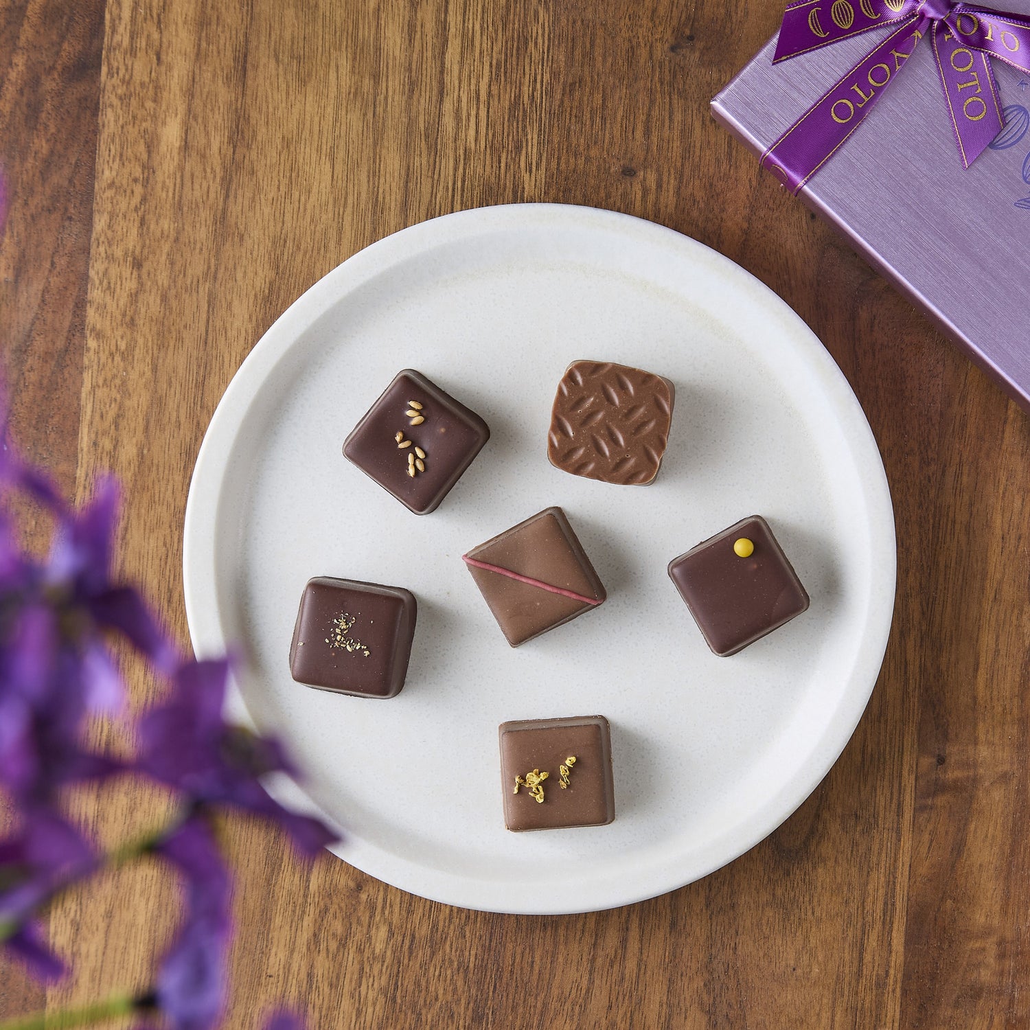 チョコレート(カカオ豆(ガーナ産)、有機ココナッツシュガー、カカオバター、有機アガベシュガー、メープルシュガー、全脂粉乳、羅漢果、脱脂粉乳、有機アガベイヌリン、バニラビーンズ、ラズベリーパウダー、ストロベリーパウダー、ターメリックパウダー)、生クリーム、蜂蜜、食塩不使用バター、米飴、柚子、抹茶、煎茶、赤ワイン、白味噌、金木犀、ごま、いちじく、山椒、食塩、シナモン、アニス、(一部に乳成分・大豆・ごまを含む)