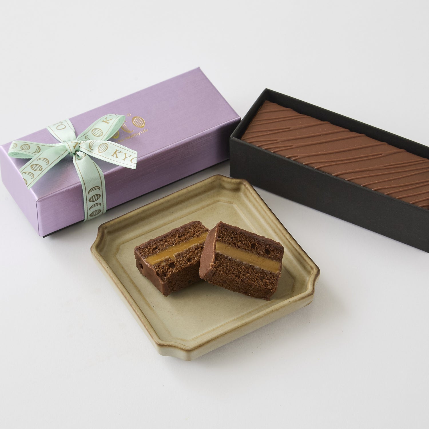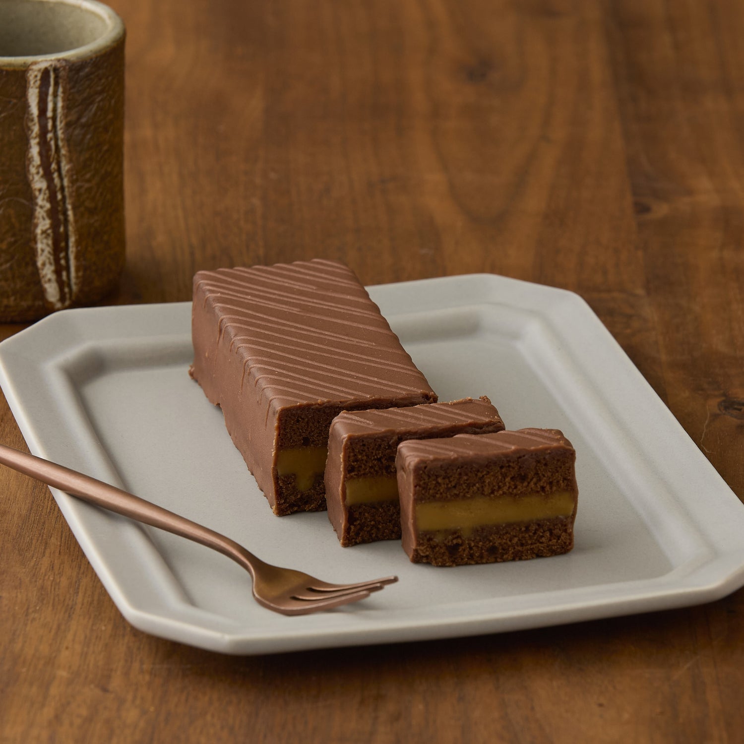 しっとり食感に焼き上げた濃厚な米粉のショコラ生地に、キャラメル風味の自家製ブロンドショコラのガナッシュをサンド。甘みのあるミルクチョコレートのコーティングが全体を調和する、マイルドな風味で味わい深いグルテンフリーの焼き菓子です。