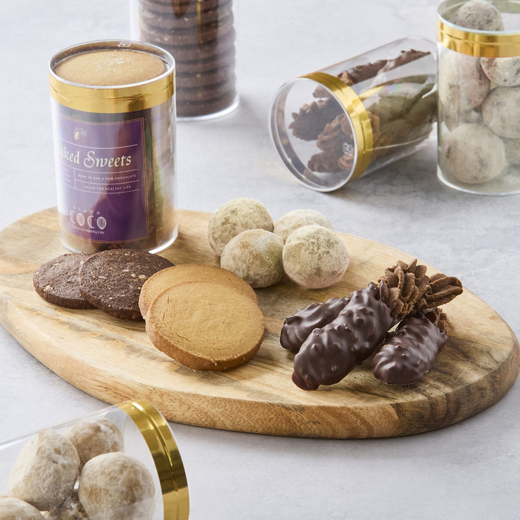 白砂糖を使わずに、羅漢果や有機ココナッツシュガーなど低GI・低糖質の甘味料で甘味を作ります。また、小麦粉は一切使用せず、米粉を使用しストレスフリーなチョコレートへ。