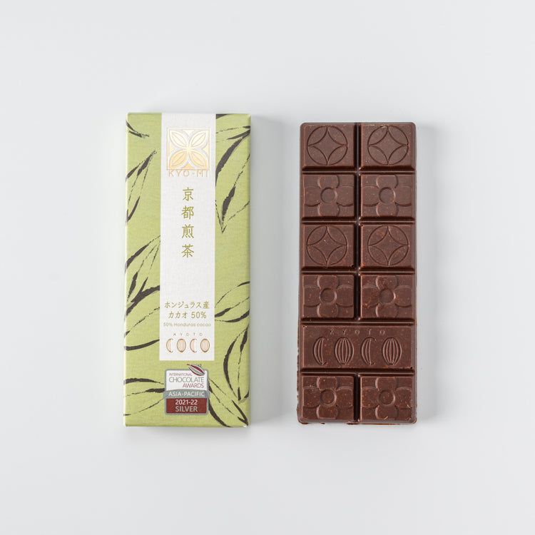 箱を開けた瞬間から煎茶の香りが広がり、ホンジュラス産カカオの軽やかな後味に煎茶の香りと味わいの余韻が続きます。