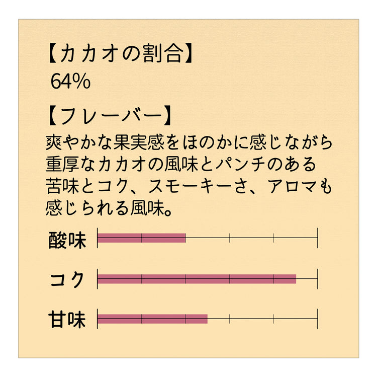 華やかな果実感をほのかに感じながら重厚なカカオの風味とパンチのある苦みとコク、スモーキーさ、アロマも感じられる風味です。