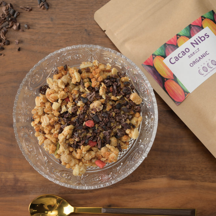 チョコレートの原料であるカカオ豆の胚乳を発酵させて砕いたものがカカオニブです。