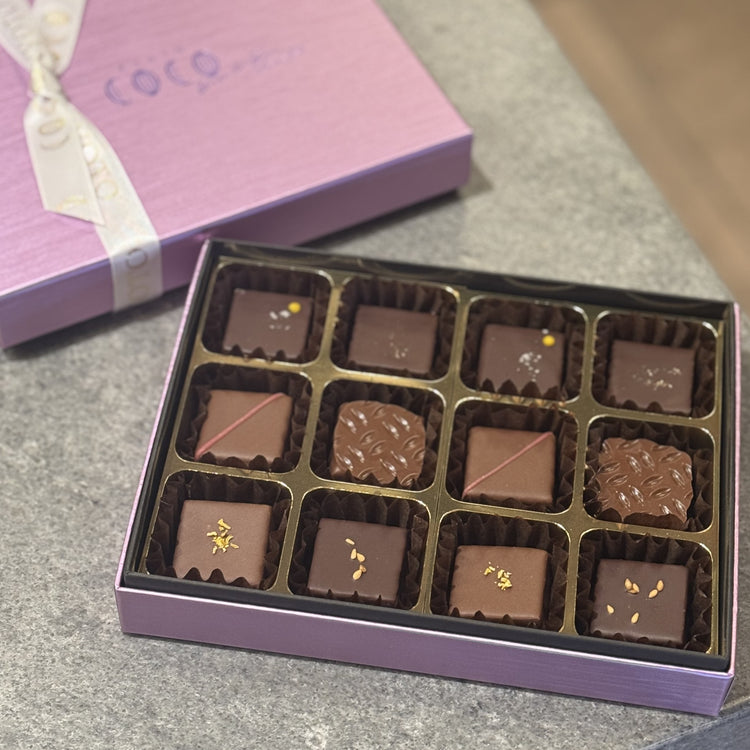 チョコレート(カカオ豆(ガーナ産)、有機ココナッツシュガー、カカオバター、有機アガベシュガー、メープルシュガー、全脂粉乳、羅漢果、脱脂粉乳、有機アガベイヌリン、バニラビーンズ、ラズベリーパウダー、ストロベリーパウダー、ターメリックパウダー)、生クリーム、蜂蜜、食塩不使用バター、米飴、柚子、抹茶、煎茶、赤ワイン、白味噌、金木犀、ごま、いちじく、山椒、食塩、シナモン、アニス、(一部に乳成分・大豆・ごまを含む)