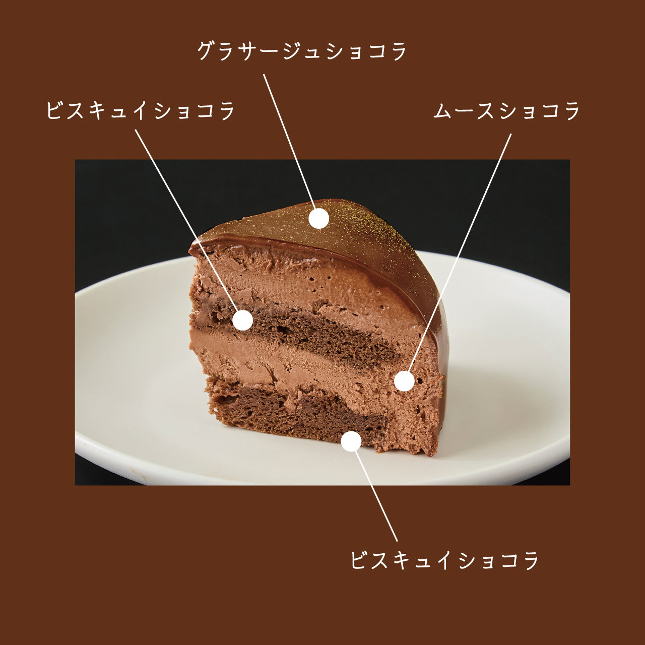 そのチョコレートをしっとりとしたチョコレート生地と重ねることで、濃厚でありながら重すぎず、すっきりとした味わいの王道チョコレートケーキに仕上げました。